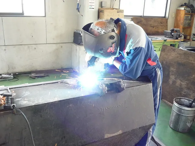溶接機で火花を散らしながらの作業。とても難しい作業ですが、熟練の整備士がきれいに直しますよ。