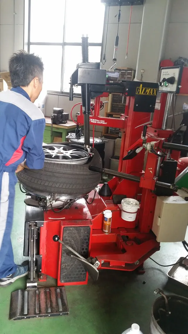 タイヤとホイールの組付け風景です。チェンジャーであっという間に組み上げます。