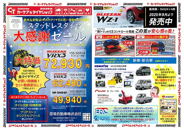 今年もどんどんタイヤ価格が値上がりしていますが、期間限定でお買い得価格にてスタッドレスタイヤを販売しております。ご購入いただいた方には、オイル交換無料券やフリースなどのプレゼントをご用意しております。どんなサイズでもお見積もりいたしますので、お気軽にお問合せ下さい!